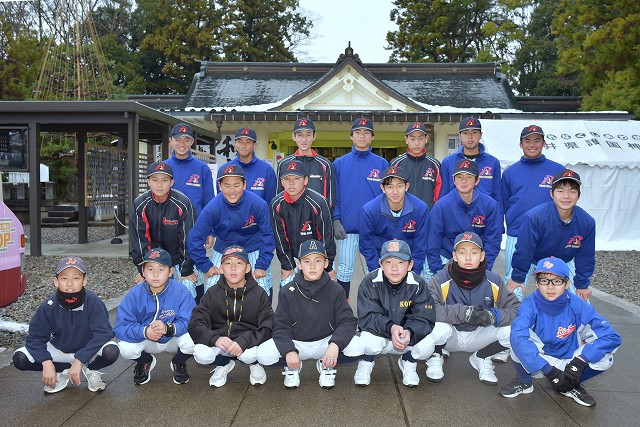 午前中から室内練習場で練習した後、新しく加わった6年生も一緒に、福井県護国神社で必勝祈願を行いました。